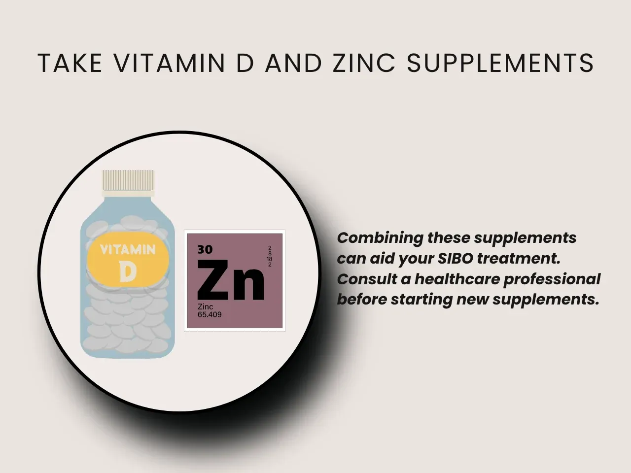 Zinc is a mineral that helps the intestines work properly. It reduces inflammation and supports the intestinal barrier—the lining of the intestine. Sometimes, this lining can be damaged in people with SIBO. Taking a zinc supplement every day can make the intestinal barrier stronger. A stronger intestinal barrier means fewer symptoms and better absorption of nutrients from food.